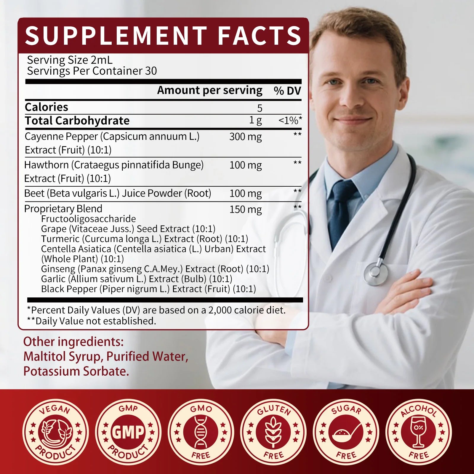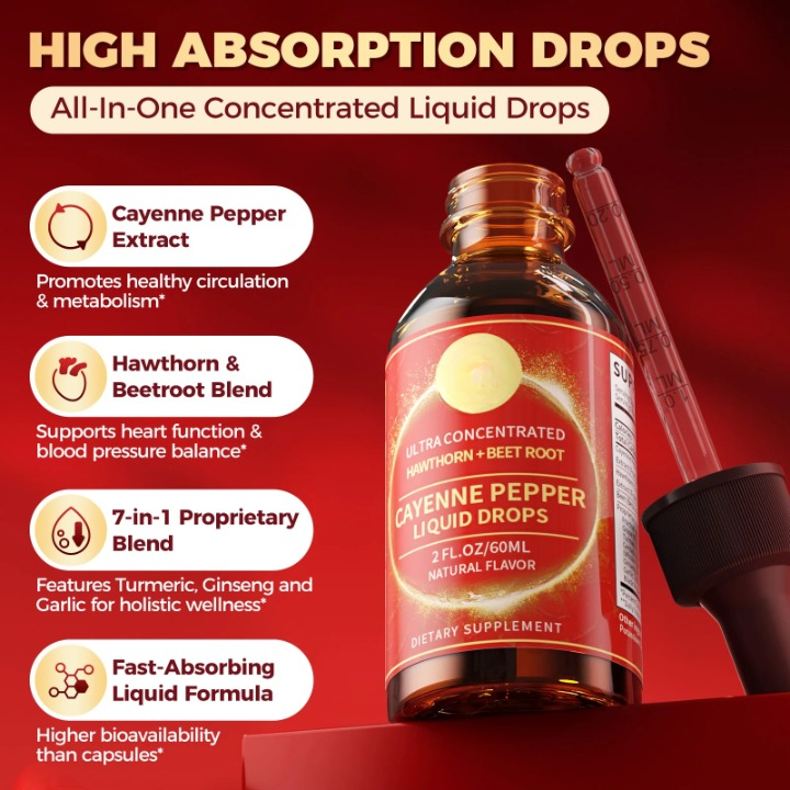 Organic Cayenne Pepper 7-in-1 Complex Drops are crafted to support heart function, healthy circulation, and balanced blood pressure through a synergistic blend of potent herbal extracts. This formula combines cayenne pepper with turmeric, ginseng, garlic, and other complementary botanicals to promote cardiovascular vitality and improved energy flow throughout the body. Each drop delivers natural compounds that help maintain healthy blood movement, support metabolic wellness, and enhance overall resilience. Designed as a fast-absorbing liquid supplement, it provides a clean, organic, and powerful approach to daily heart and wellness support.